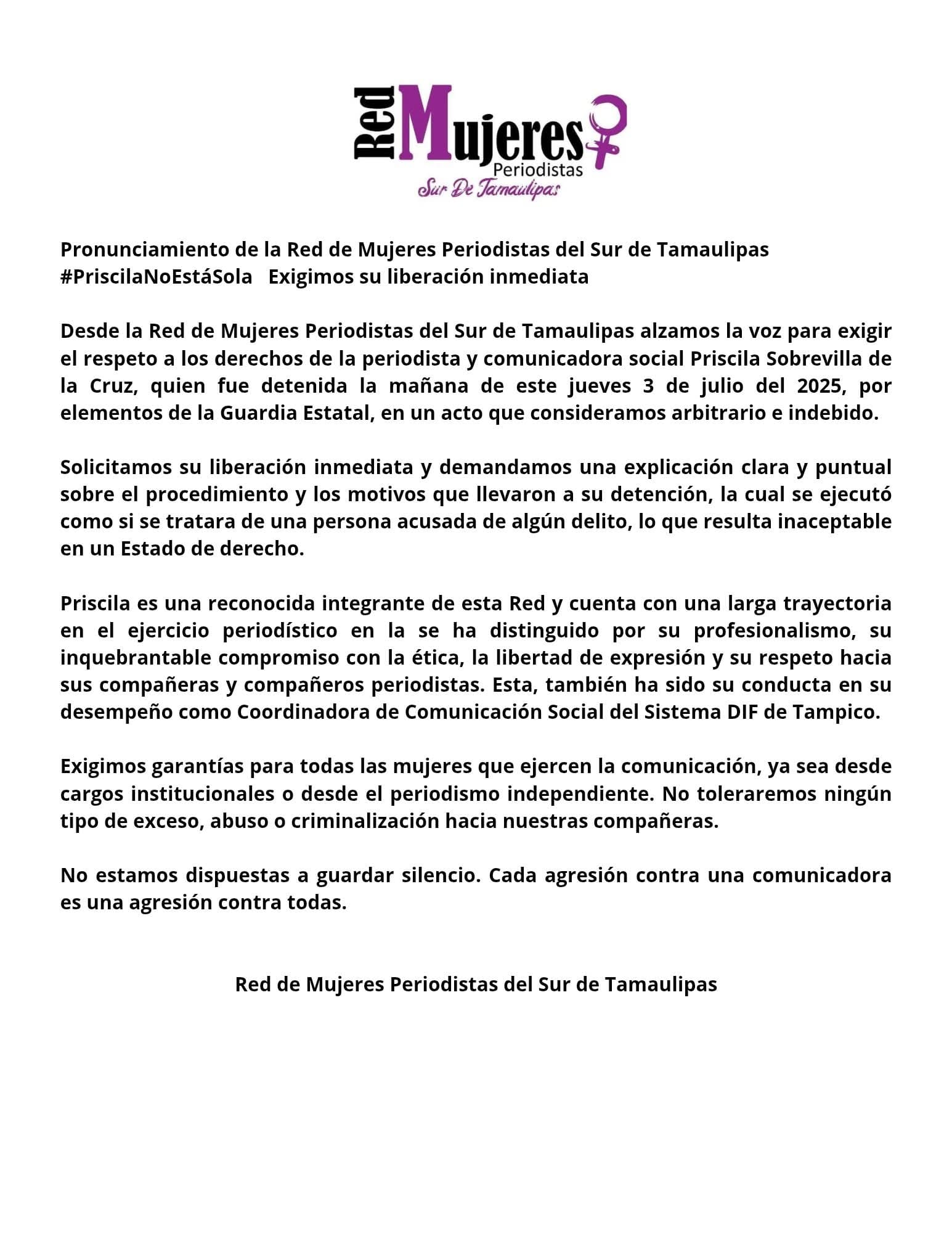 La Red de Mujeres Periodistas del Sur de Tamaulipas considera la acción un abuso de autoridad y exige su liberación inmediata.