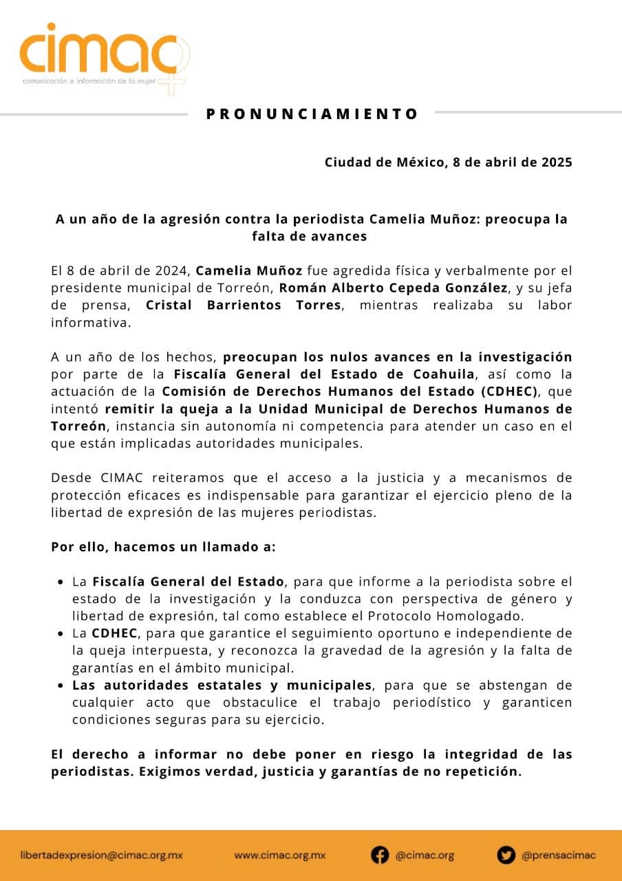 Ciudad de México, 8 de abril de 2025.- A un año de haber sido agredida física y verbalmente por el presidente municipal de Torreón, Román Alberto Cepeda González, y su jefa de prensa, Cristal Barrientos Torres, la periodista Camelia Muñoz sigue sin obtener justicia. La organización Comunicación e Información de la Mujer A.C. (CIMAC) denunció este lunes la falta de avances en la investigación por parte de la Fiscalía General del Estado de Coahuila, así como el actuar cuestionable de la Comisión de Derechos Humanos del Estado de Coahuila (CDHEC).
