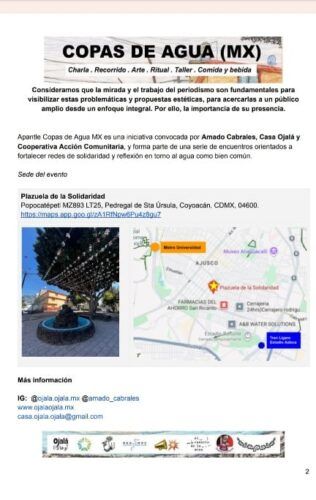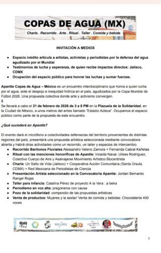El próximo 21 de febrero, la Plazuela de la Solidaridad será escenario de Apantle Copas de Agua – México, un encuentro interdisciplinario que busca honrar las luchas comunitarias frente al despojo y la inequidad hídrica, problemáticas que —señalan sus organizadores— podrían intensificarse ante la demanda de infraestructura y servicios que implica el Mundial.