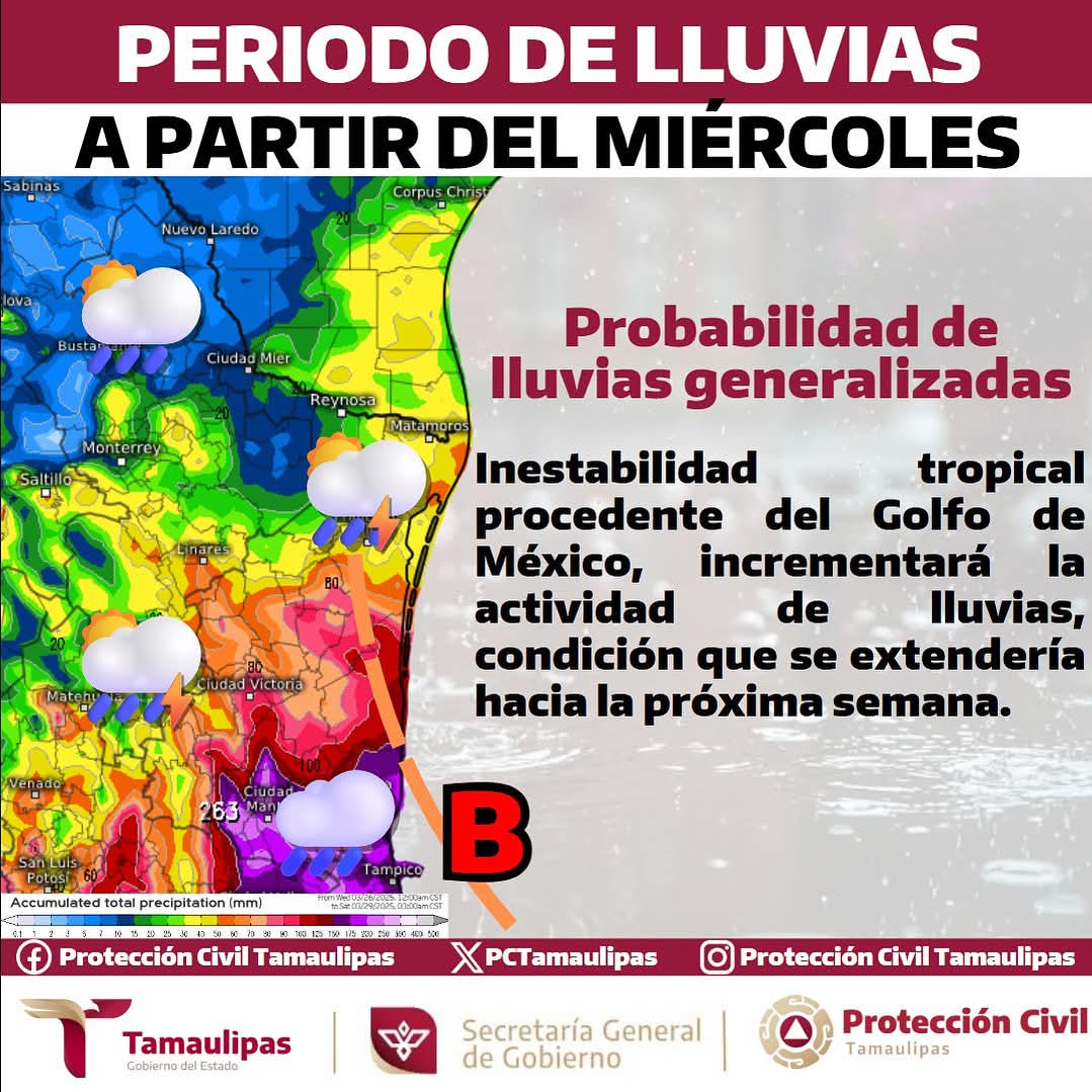 Tamaulipas se prepara para varios días de intensas lluvias, a partir del miércoles o jueves, por la llegada de inestabilidad tropical desde el Golfo de México. Este fenómeno podría extenderse hasta mediados de la próxima semana, con acumulados importantes de precipitación que aumentan el riesgo de afectaciones.