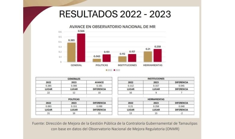 Ciudad Victoria, Tamaulipas.- La contralora gubernamental, Norma Angélica Pedraza Melo, anunció que Tamaulipas avanza en el indicador de la Estrategia Nacional de Mejora Regulatoria 2023. Lo anterior con base en el informe del Observatorio Nacional publicado en abril, que con base en la metodología de tres pilares que integran políticas, instituciones y herramientas, se determina a Tamaulipas como la entidad con más puestos avanzados en esta área, ya que en 2022 se encontraba en el lugar 22 y actualmente se sitúa a la entidad en el lugar número 12, lo que refleja un avance positivo de 10 posiciones.