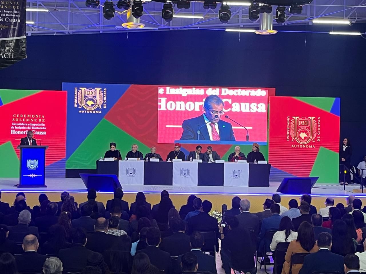La Universidad Autónoma de Chiapas (UNACH) vivió un momento histórico este jueves 25 de septiembre al investir como Doctor Honoris Causa al maestro Carlos Alberto Navarrete Cáceres, en un acto solemne que también reconoció la trayectoria de Antonio García de León y Javier Espinosa Mandujano.