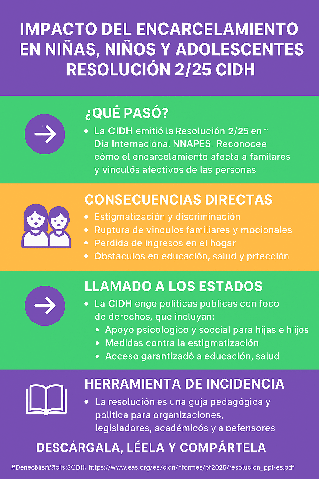 En el marco del Día Internacional de Niñas, Niños y Adolescentes con Personas Encarceladas (NNAPES), la Comisión Interamericana de Derechos Humanos (CIDH) adoptó la Resolución 2/25, un documento que busca visibilizar cómo el encarcelamiento trasciende a la persona privada de libertad y afecta de manera directa a sus familiares y vínculos afectivos.