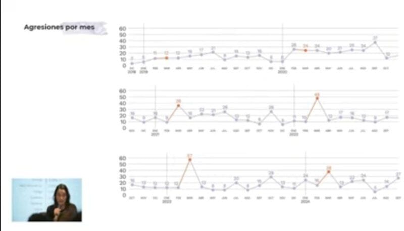 - Principales agresiones: bloqueos informativos (14.38%), amenazas (13.04%), intimidación (12.20%) y agresión física (9.34%).