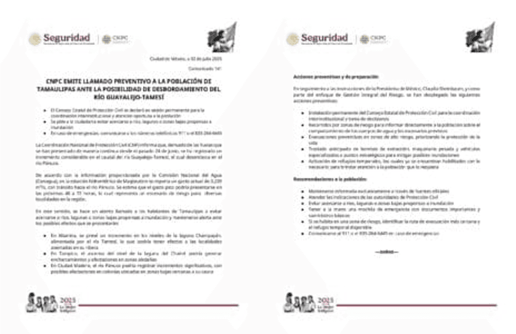 Ciudad de México, 2 de julio de 2025.– La Coordinación Nacional de Protección Civil (CNPC) emitió un llamado preventivo a la población de Tamaulipas ante el riesgo de desbordamiento del río Guayalejo-Tamesí, derivado de las lluvias continuas registradas desde el pasado 24 de junio.