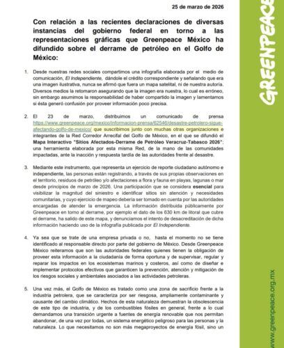 Sin embargo, la discusión pública se desvió cuando circuló una infografía —no elaborada por la organización— que generó confusión sobre la magnitud del derrame. Greenpeace reconoció haberla compartido, aunque aclaró que se trataba de un material ilustrativo.