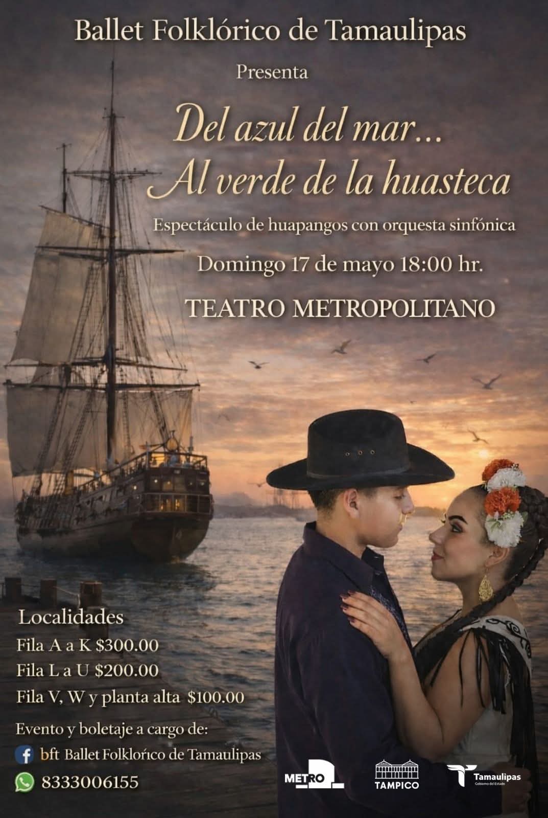 La función se realizará el próximo domingo 17 de mayo a las 18:00 horas en el Teatro Metropolitano, uno de los principales recintos culturales del sur del estado.De acuerdo con la información difundida por la agrupación, el montaje busca destacar las raíces musicales y dancísticas de Tamaulipas, incorporando elementos escénicos que evocan tanto el paisaje maríimo como la tradición huasteca, en una narrativa visual y sonora dirigida a públicos de todas las edades.Costos y acceso Las localidades estarán disponibles en distintos rangos;