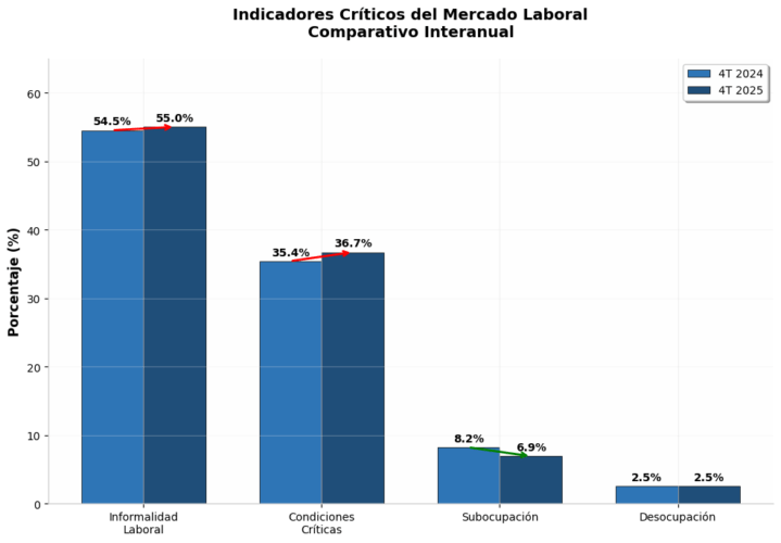 La imagen destaca visualmente las principales tensiones del mercado laboral: crecimiento cuantitativo pero deterioro cualitativo, con flechas indicando el empeoramiento en informalidad y condiciones críticas, versus la mejora en subocupación