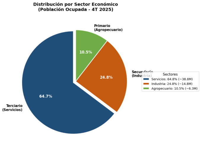 Los sectores dinamizadores del empleo fueron el comercio (+298,000), construcción, transportes y comunicaciones, y el sector gubernamental. En contraste, la industria manufacturera perdió 48,000 empleos y los servicios sociales registraron una caída de 238,000 plazas —posiblemente vinculada a ajustes en el gasto público federal.