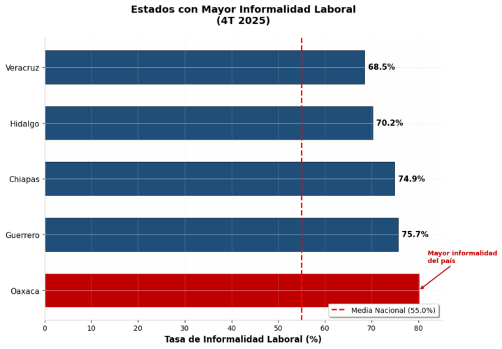 Geográficamente, la dualidad del mercado laboral se acentúa. Mientras Baja California Sur lidera la participación económica (67.2%) y Nuevo León mantiene bajos niveles de informalidad (35.4%) y condiciones críticas (21.2%), estados como Chiapas (49.2% de TCCO), Oaxaca (80.1% de informalidad) y Guerrero (75.7% de informalidad) exhiben los rezagos estructurales del sur-sureste mexicano.