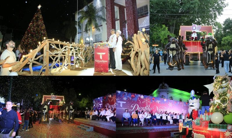 Ciudad Victoria, Tamaulipas.- En medio de una gran fiesta que culminó con el encendido del monumental pino navideño, el gobernador Américo Villarreal Anaya, junto a la presidenta del DIF Estatal, doctora María de Villarreal, deseó a las familias tamaulipecas que esta sea la mejor de las celebraciones y estén llenas de paz, reflexión y una visión humanista para poder seguir avanzando y progresando con bienestar.