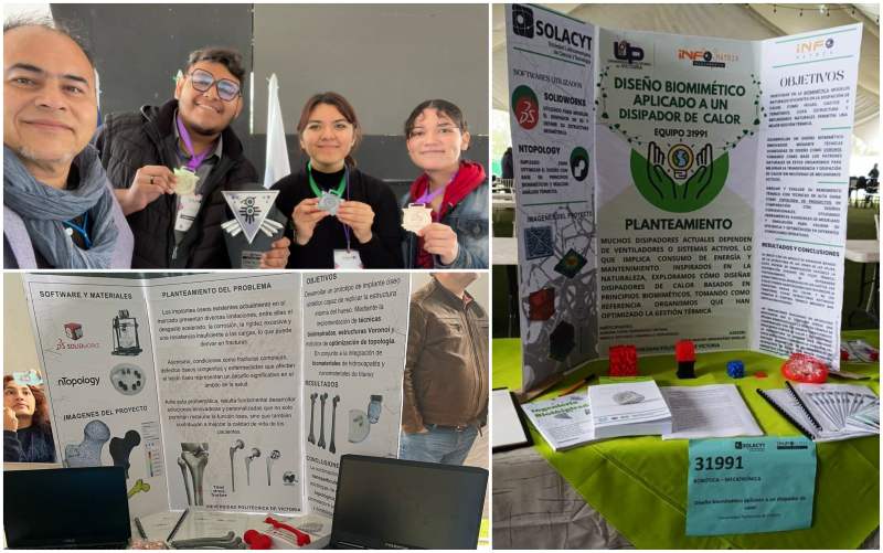Destacó que Aurora Sofía Hernández y Marco Antonio Camarillo, estudiantes del quinto cuatrimestre de Ingeniería Mecatrónica, obtuvieron la Medalla de Platino en la categoría de Mecatrónica y Prototipos Electrónicos con su proyecto “Diseño Biomimético Aplicado a un Disipador de Calor”. Esta distinción les otorgó pase directo a la final internacional, que se celebrará en Colombia en noviembre de este año.