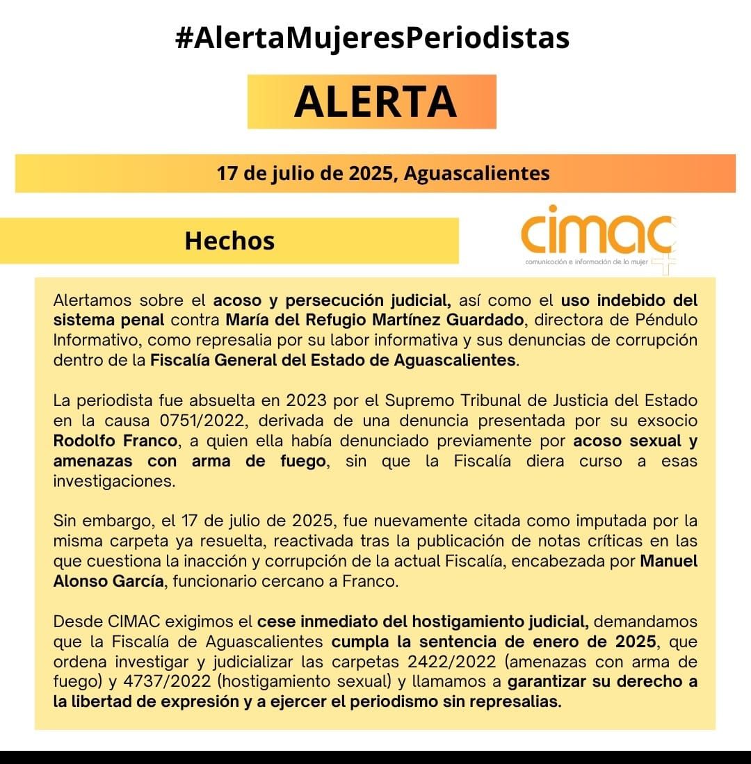 La organización CIMAC emitió una alerta bajo el hashtag #AlertaMujeresPeriodistas, denunciando el uso indebido del sistema penal como mecanismo de intimidación contra Martínez Guardado. Exigen el cese inmediato del hostigamiento judicial y el cumplimiento de la sentencia dictada a su favor en enero de 2025.