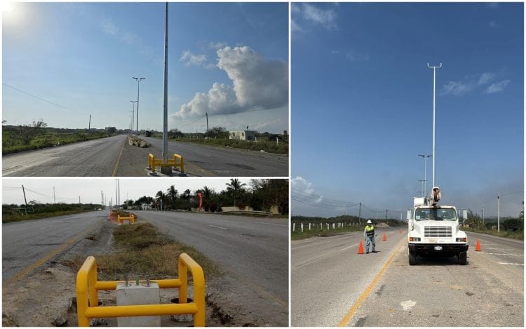 Destacó que, esta red de alumbrado público cuenta con 128 postes y 256 luminarias y en la última etapa de la obra, se construyeron las bases de concreto hidráulico para instalar los postes metálicos galvanizados colocando 28 lámparas solares en la parte de Altamira, mientras que en la zona de Ciudad Madero se realizaron las mismas labores con instalación de 34 lámparas para terminar la obra en esta importante avenida.