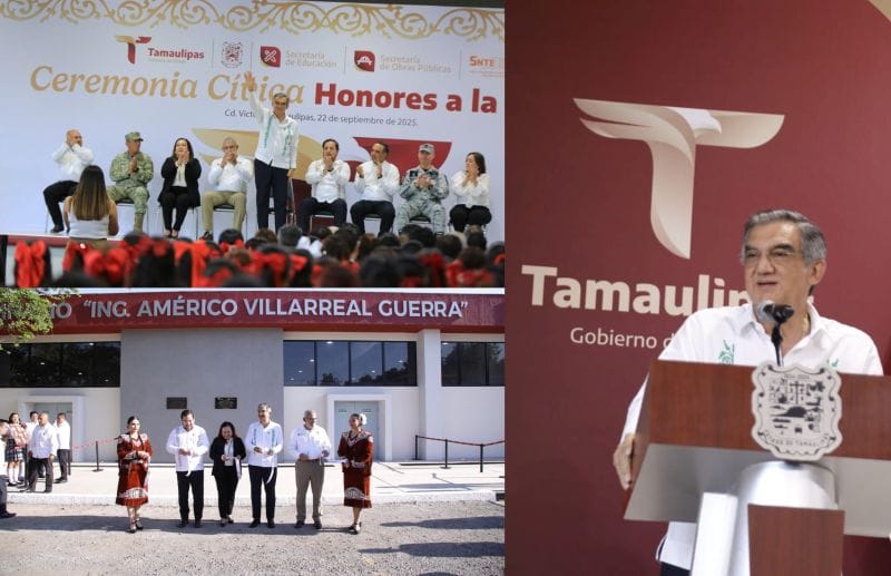 “Hace más de 30 años, un gobernador de voluntad y trabajo, el ingeniero Américo Villarreal Guerra, entregó en este mismo lugar una techumbre que por años fue refugio y punto de encuentro de la comunidad normalista, y hoy aquel legado, que se convirtió en un símbolo de confianza en el futuro, es honrado y prolongado por nuestro gobernador Américo Villarreal Anaya”, expresó.