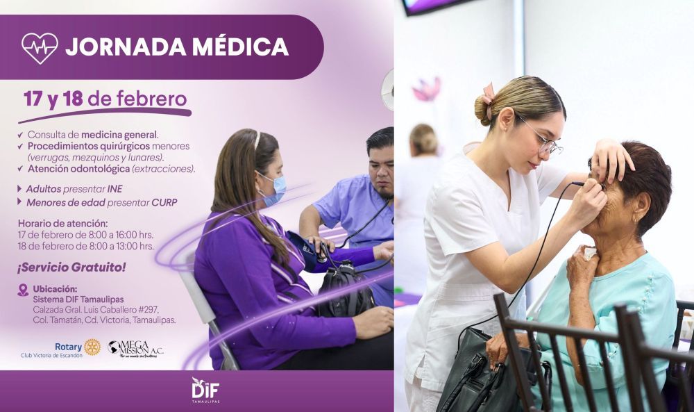 Ciudad Victoria, Tamaulipas.– Con el compromiso de acercar servicios de salud accesibles y de calidad a cada persona, grupo o población de atención prioritaria, el Sistema DIF Tamaulipas, que preside la doctora María de Villarreal, en coordinación con el Club Rotario Victoria de Escandón Asociación Civil, llevará a cabo la jornada médica “Megamissions” los días 17 y 18 de febrero en Ciudad Victoria.