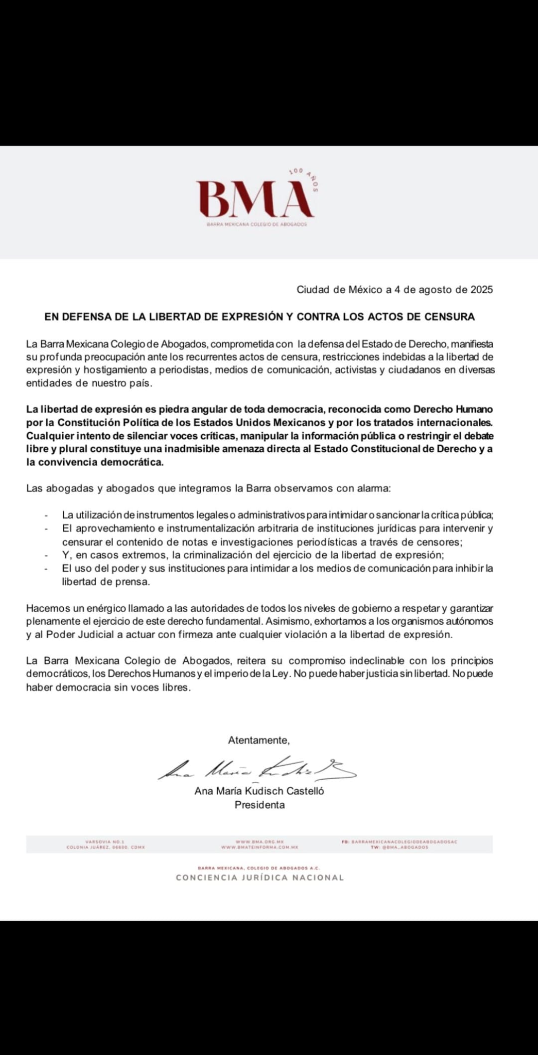 El comunicado subraya que la libertad de expresión es un derecho humano reconocido tanto por la Constitución mexicana como por los tratados internacionales. Sin ella, advierte la BMCA, no puede haber justicia ni democracia.