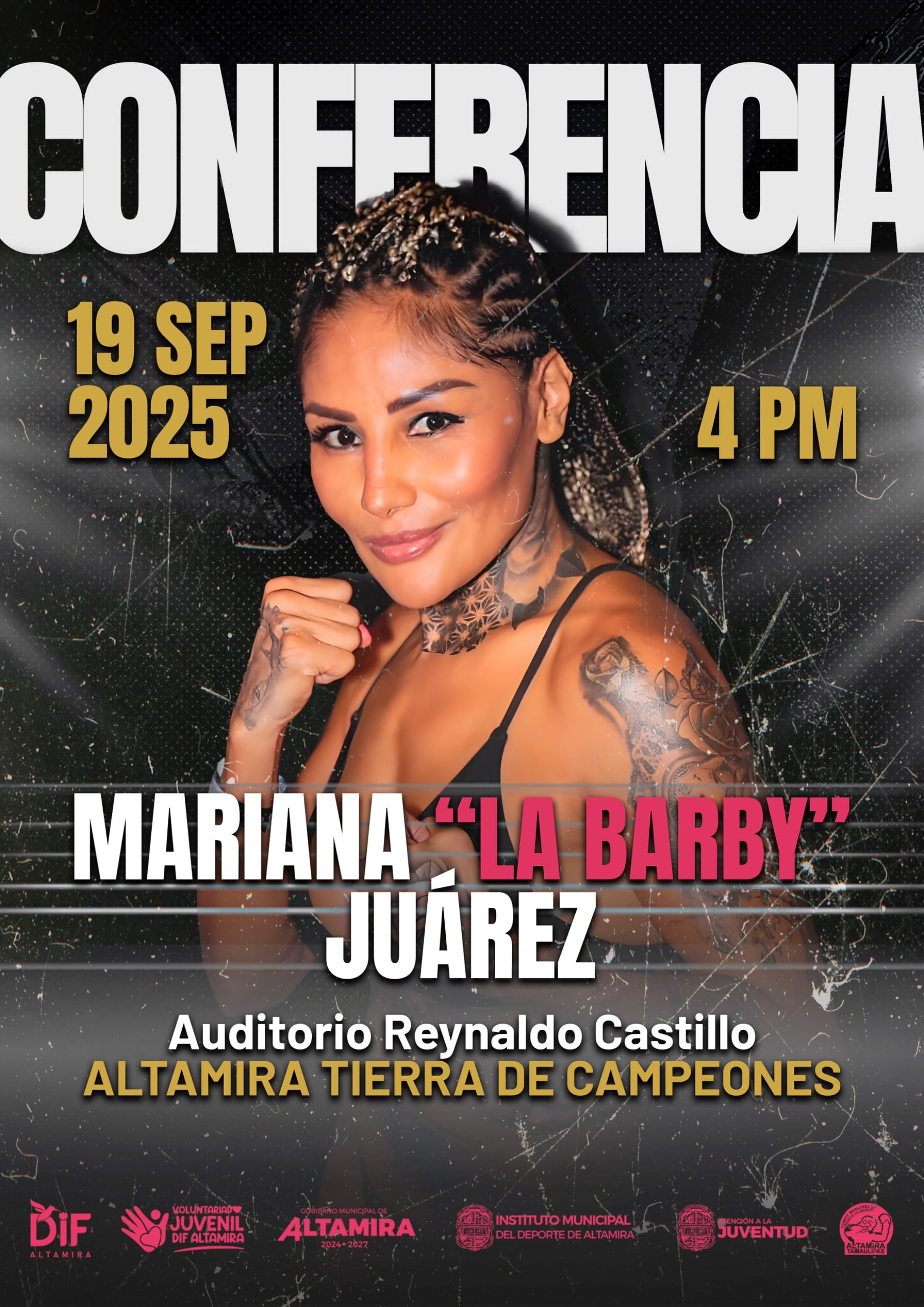 Altamira, Tamps., 19 de septiembre de 2025. — La reconocida boxeadora mexicana Mariana “La Barby” Juárez, referente del boxeo femenil y campeona mundial en distintas categorías, ofrecerá una conferencia este viernes 19 de septiembre a las 4:00 de la tarde, en el auditorio Reynaldo Castillo Portes.
