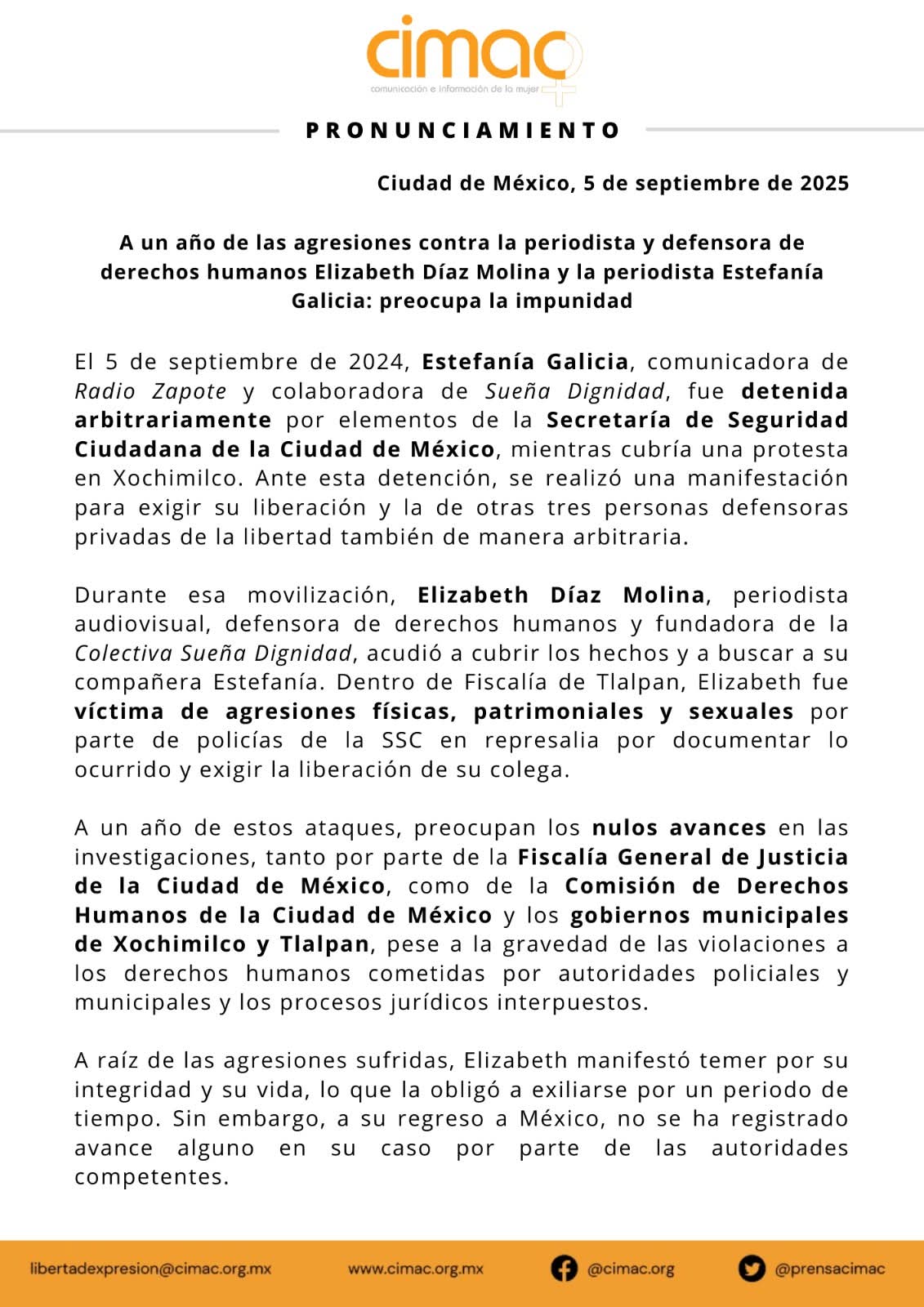 El 5 de septiembre de 2024, Estefanía fue detenida mientras cubría una protesta en Xochimilco. Elizabeth, que acudió a documentar el hecho, terminó siendo víctima de agresiones físicas, patrimoniales y sexuales a manos de policías de la SSC. La consecuencia inmediata: exilio forzado para salvar su vida. La consecuencia estructural: un mensaje brutal y claro para quienes se atreven a informar y defender derechos humanos en esta ciudad.