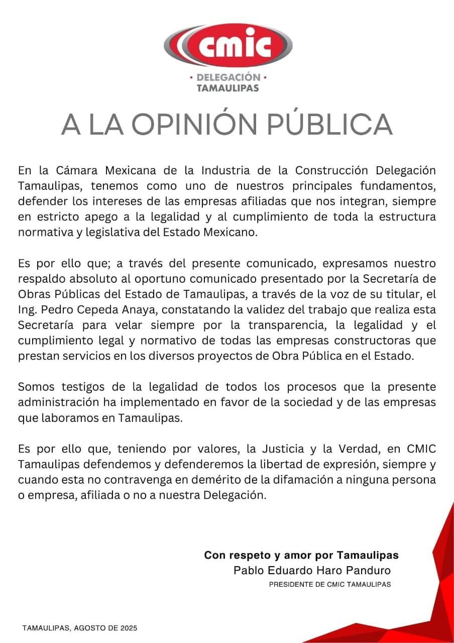 El reciente comunicado de la Cámara Mexicana de la Industria de la Construcción (CMIC), Delegación Tamaulipas, plantea un respaldo explícito a la Secretaría de Obras Públicas del Estado y a su titular, Pedro Cepeda Anaya. La declaración enfatiza valores como la legalidad, la transparencia y la defensa de la libertad de expresión, aunque con matices que invitan a un análisis más crítico.