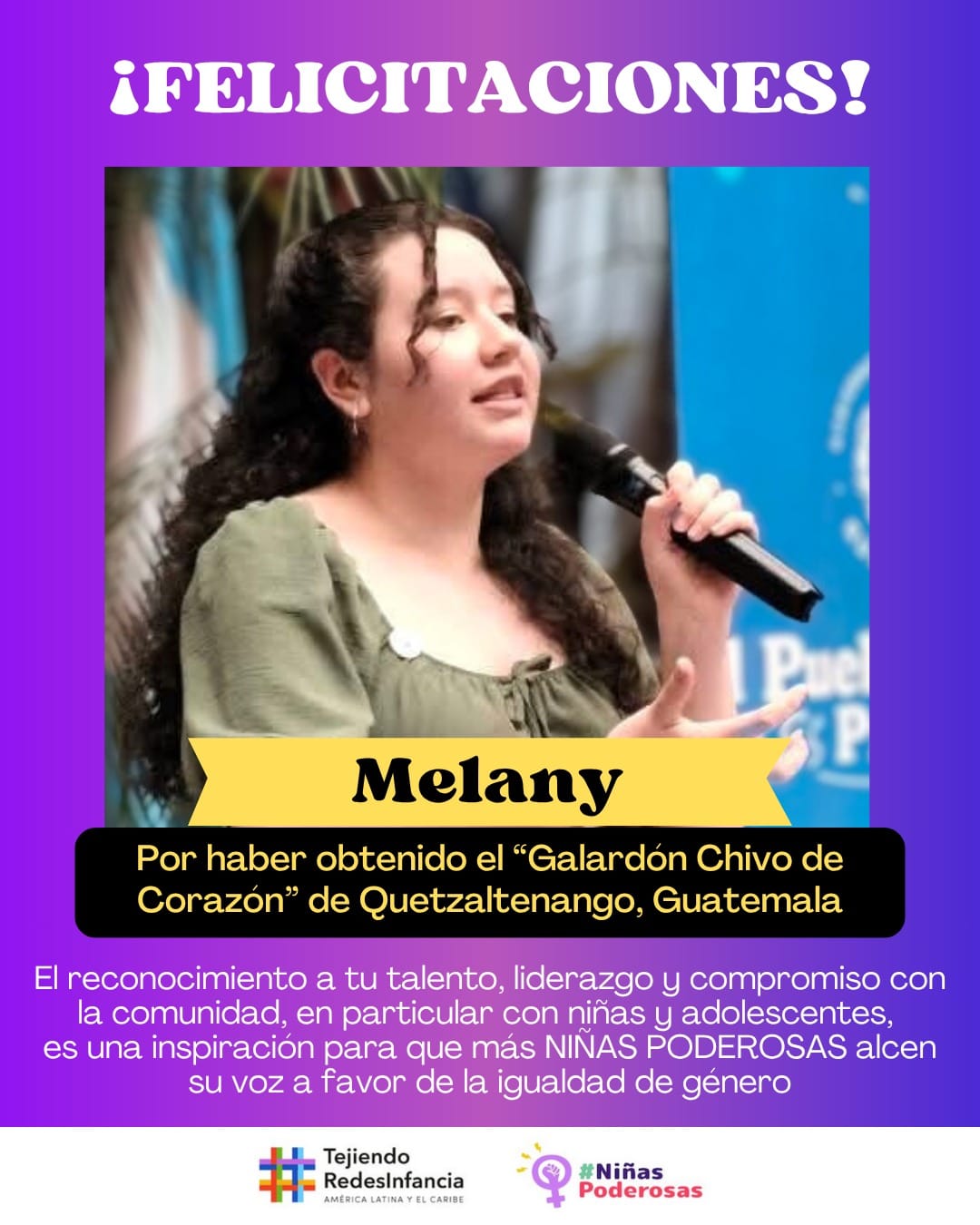A sus 15 años, Melany se ha convertido en un rostro visible del activismo juvenil en Guatemala. Integrante de Niñas Poderosas y fundadora de la iniciativa Girls Transforman, fue reconocida con el galardón “Chivos de Corazón” en la categoría Liderazgo Juvenil, otorgado por la Gobernación Departamental de Quetzaltenango y la Unidad para la Prevención Comunitaria de la Violencia (UPCV). El premio, que por primera vez distingue a jóvenes comprometidos con la transformación social, simboliza una apuesta institucional por visibilizar el liderazgo de las nuevas generaciones.