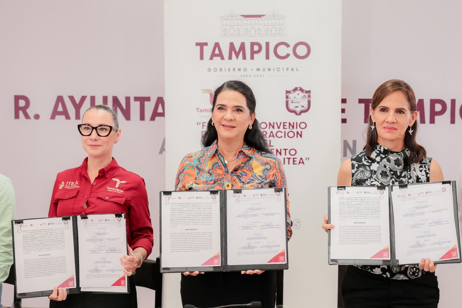 Durante un acto celebrado en la Sala de Cabildo, la alcaldesa porteña estuvo acompañada por la Lic. Gloria Guadalupe González González, directora estatal del ITEA; Luz Adriana Villarreal Anaya, titular del Sistema DIF Tampico; Carlos Alberto García Porres, Secretario General del Ayuntamiento; Prof. Nicandro Vadir Alvarado Maldonado, Coordinador de Zona ITEA Tampico-Madero y Libby Zácil Adame Estrada, Directora del Instituto de la Mujer de Tampico.
