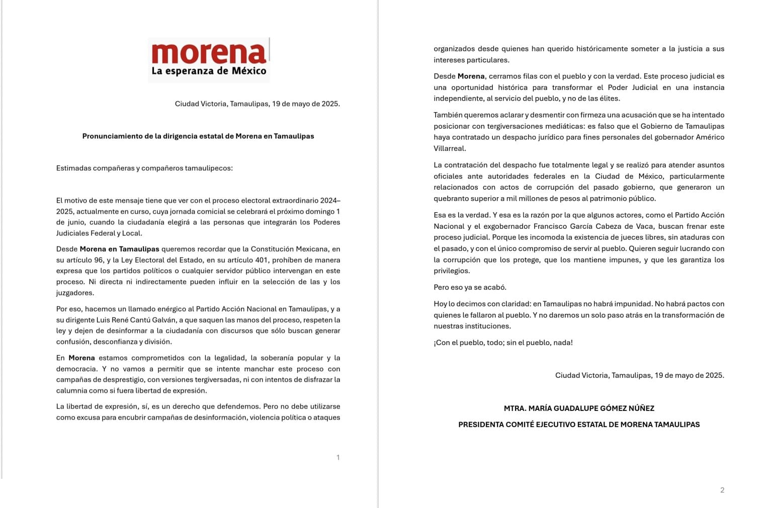 Ciudad Victoria, Tamaulipas.— 19 de mayo de 2025.- La dirigencia estatal de Morena en Tamaulipas emitió este lunes un pronunciamiento en el que acusa directamente al Partido Acción Nacional (PAN) y a su dirigente estatal, Luis René Cantú Galván, de intervenir ilegalmente en el proceso electoral extraordinario 2024–2025, que busca renovar los Poderes Judiciales Federal y Local.