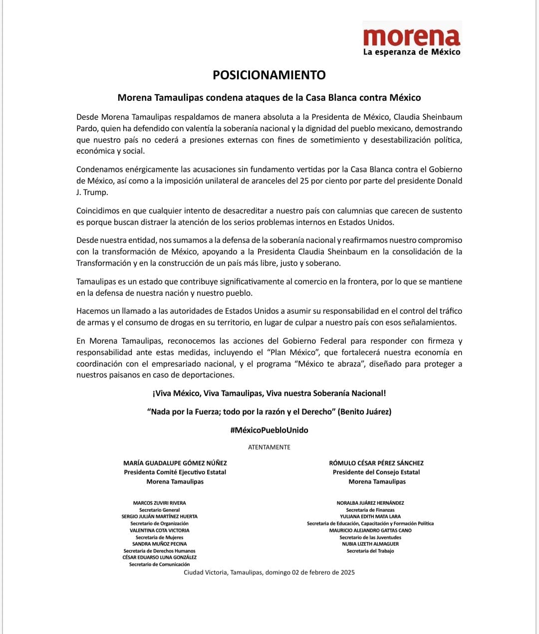 Ciudad Victoria, Tamaulipas, 2 de febrero de 2025. La dirigencia estatal de Morena en Tamaulipas expresó su respaldo absoluto a la presidenta Claudia Sheinbaum Pardo y rechazó las declaraciones de la Casa Blanca que, aseguran, buscan desacreditar al gobierno mexicano.