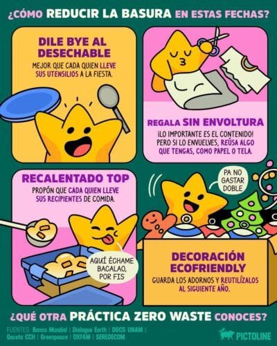 Eliminar desechables en reuniones, reutilizar envolturas, compartir recipientes para evitar desperdicio de comida y conservar decoraciones para siguientes años son acciones simples, pero con efectos reales.