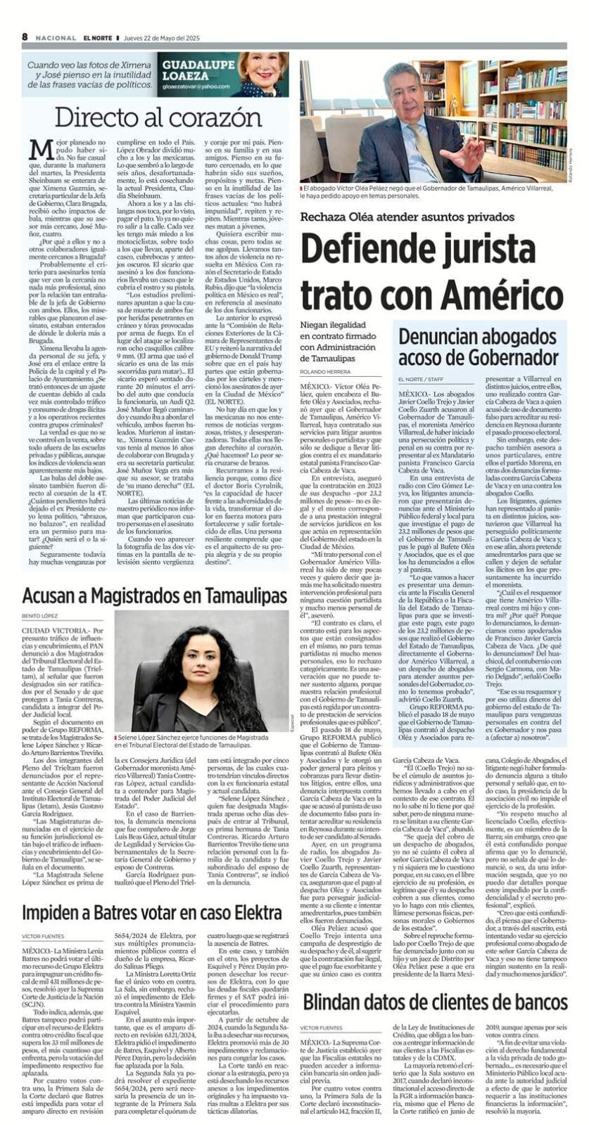 La información fue publicada este jueves en una nota de Rolando Herrera para el periódico El Norte, del grupo editorial Reforma. En ella, Oléa afirmó que su trato con el gobernador Américo Villarreal ha sido limitado, y que nunca ha recibido instrucciones para intervenir en asuntos personales o partidistas.