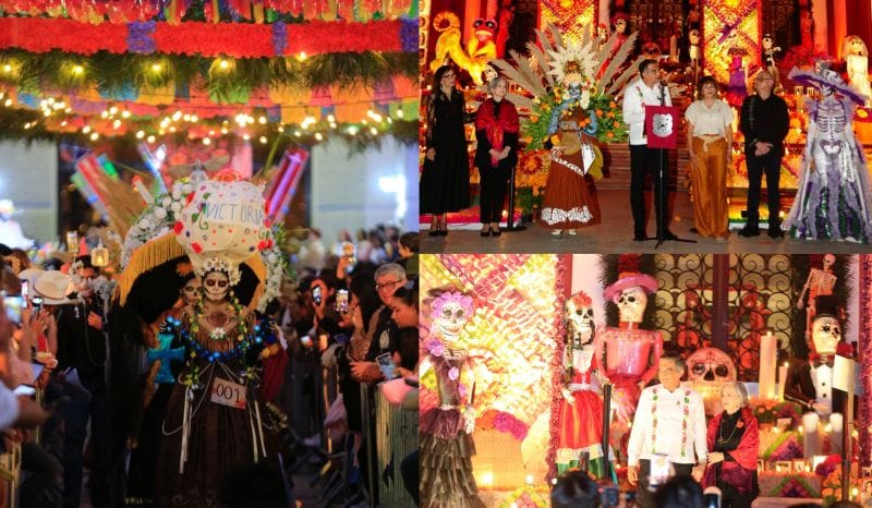 Ciudad Victoria, Tamaulipas.- En un ambiente impregnado por el aroma de la flor de cempasúchil, el pan de muerto y las luces de las velas, el gobernador Américo Villarreal Anaya y la presidenta del Sistema DIF Estatal, María de Villarreal presidieron la premiación del concurso estatal de catrinas y catrines «Almas Tamaulipecas» y la muestra del altar monumental del Día de Muertos en las escalinatas de Palacio de Gobierno .