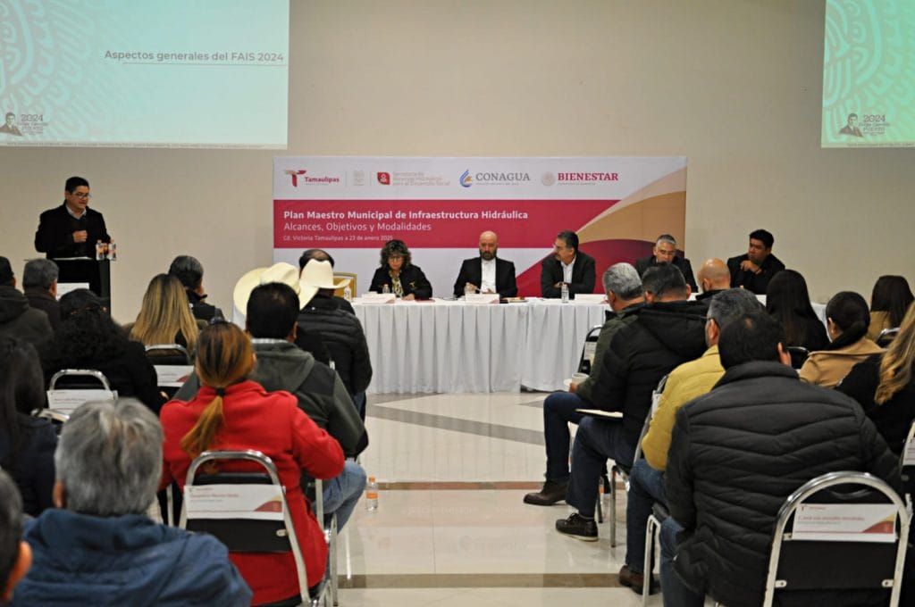 Ciudad Victoria, Tamaulipas, 23 de enero de 2025. – La Secretaría de Recursos Hidráulicos para el Desarrollo Social, bajo la dirección de Raúl Quiroga Álvarez, en coordinación con la Comisión Nacional del Agua (CONAGUA), la Auditoría Superior del Estado (ASE), la Secretaría de Bienestar del Estado y el Sistema de Administración Tributaria (SAT), llevó a cabo la presentación de los objetivos para la elaboración del Plan Municipal de Infraestructura Hidráulica que deriva del Plan Nacional Hídrico impulsado por la presidenta Claudia Shienbaum.