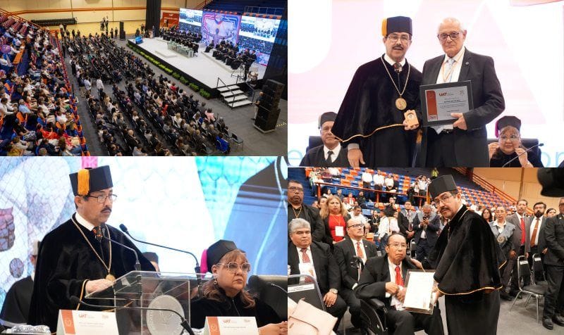 También se rindió homenaje póstumo al Dr. Juan Plutarco Arcos Martínez, de la Facultad de Derecho y Ciencias Sociales Victoria, por 30 años de destacada trayectoria. Fue docente, tutor y figura clave en la transformación del sistema judicial en Tamaulipas. El rector le hizo entrega de este reconocimiento a sus familiares, resaltando que su legado académico y humano seguirá presente en la Universidad.
