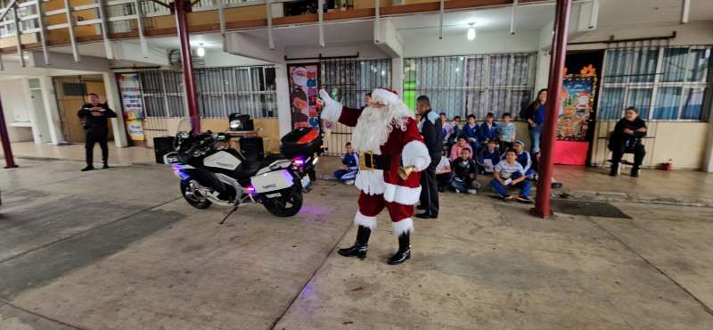 Durante esta semana, “Santa Claus Motorizado”, acompañado por agentes viales, recorrerá más instituciones educativas de la zona sur para repartir sonrisas y momentos de felicidad a la comunidad escolar.