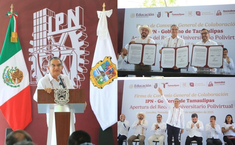 González, Tamaulipas. – El gobernador Américo Villarreal Anaya firmó el convenio de colaboración con el Instituto Politécnico Nacional e inauguró el Recinto Universitario Polivirtual, una nueva plataforma académica con la calidad y la excelencia educativa que distingue a esta prestigiada institución y que, por primera vez, se pone en marcha en todo el país.
